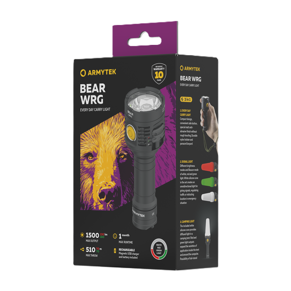 Maak kennis met de Armytek Bear WRG: de zaklamp voor wie geen compromissen accepteert en altijd voorbereid wil zijn. Deze compacte krachtpatser combineert extreme lichtopbrengst met ongekende veelzijdigheid en is ontworpen voor avonturiers, professionals en iedereen die onder alle omstandigheden wil kunnen vertrouwen op zijn uitrusting.