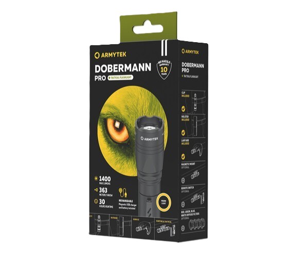 De Armytek Dobermann Pro is een veelzijdige en robuuste zaklamp, ontworpen voor zowel tactische als dagelijkse toepassingen. Met zijn indrukwekkende lichtvermogen van 1400 lumen, betrouwbare magnetische oplaadtechnologie en uitstekende duurzaamheid is deze zaklamp ideaal voor professionals, avonturiers en tactische toepassingen. Of je nu in de natuur bent, op zoek bent naar een betrouwbare werklamp of tactische verlichting nodig hebt, de Dobermann Pro staat altijd klaar om te presteren.