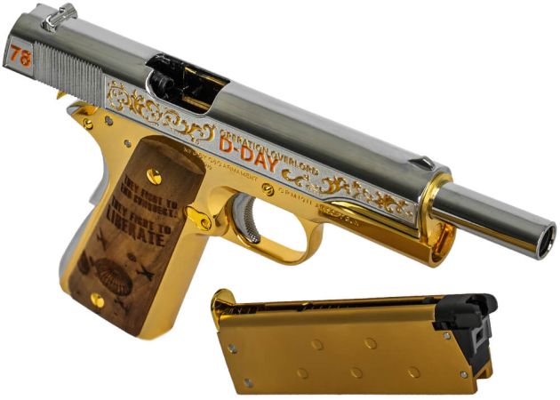 De G&G GPM1911 D-Day Limited Version is een indrukwekkende airsoftreplica die speciaal is uitgebracht ter ere van het 78ste jubileum van D-Day. Met zijn zilverkleurige slede, goudkleurige frame en gedetailleerde graveringen die verwijzen naar de historische gebeurtenissen van 1944, is dit een echte blikvanger en een waardevol collector’s item. De replica wordt bovendien geleverd in een stijlvolle presentatiekoffer, waardoor hij perfect tot zijn recht komt in elke verzameling.